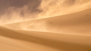 黄砂が発生する最大の原因は、乾燥した大陸内の砂漠や裸地で強い風が吹くことです。この強風で細かい土ぼこりが舞い上がり、大気に乗って移動します。量が多いと、空気が霞んで見えることもあります。